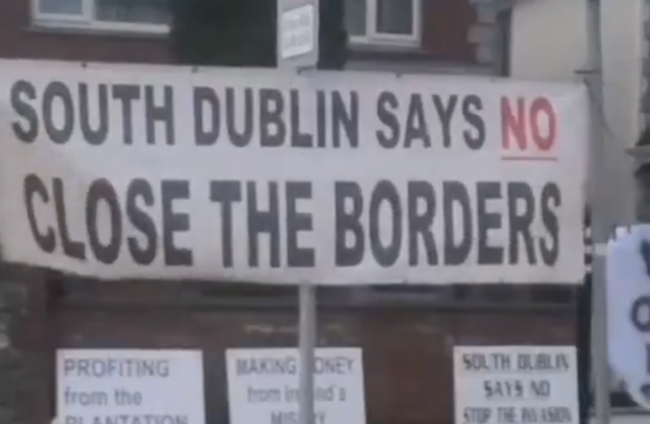In footage shared on social media, masked men could be seen appearing to stop a car from turning onto the street.  Slogans referencing a “plantation” also appeared on the banners, a term used by Irish advocates of the white nationalist ‘Great Replacement’ conspiracy theory
