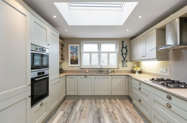 The open plan kitchen, dining and living area is sure to be a busy spot. Thoughtfully designed, this space is bathed in natural light thanks to a series of Farko roof lights. The sleek yet traditional hardwood kitchen is fitted with quartz countertops, high-quality appliances and antique-style brass hardware, making it as functional as it is beautiful. A gas stove adds to the cosy atmosphere, while built-in storage ensures clutter-free living.