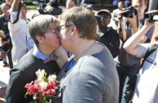 Nicole Pries and Lindsey Oliver share a kiss as they celebrate being one of the first same-sex couples in Virginia to marry. AP/Press Association Images