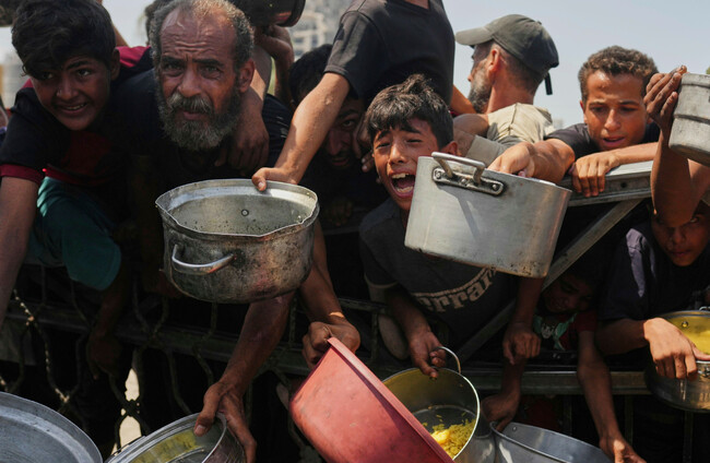 Palestinians struggle to receive food in Gaza City, 16 August 2025. Alamy