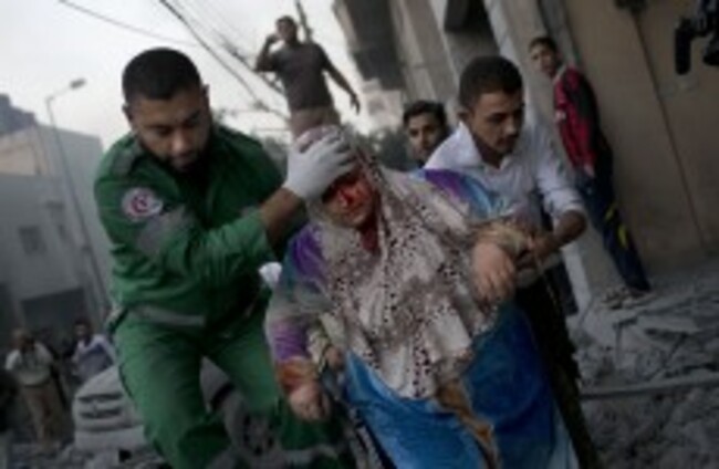 A Palestinian woman is helped after being injured during an Israeli forces strike on a sports field next to her house in Gaza City. Bernat Armangue/AP/Press Association Images