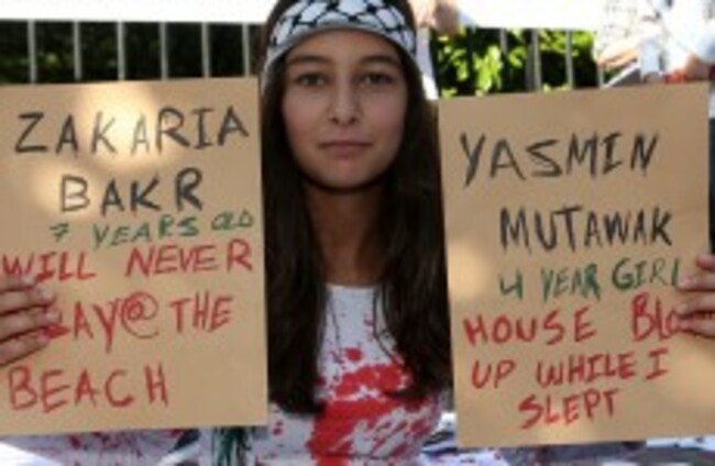 Jeneen Ijawi (12) from Dublin holds up two names of children killied in Gaza at Wednesday's protest. Sam Boal/Photocall Ireland