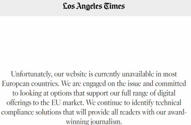 SEVERAL MAJOR US news websites including the Los Angeles Times were blocked in Europe today after the EU’s new data protection laws came into effect.