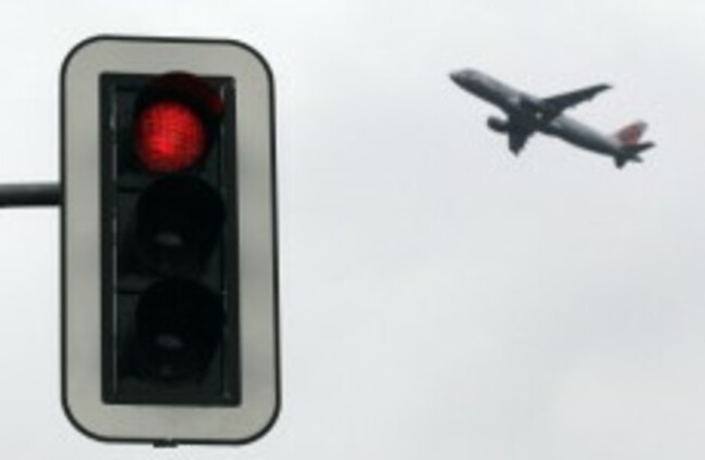 An aeroplane takes off behind a red traffic light at the international airport in Dusseldorf yesterday. An air traffic controllers' strike planned for tomorrow could wreak havoc on the travel plans of many. Frank Augstein/AP