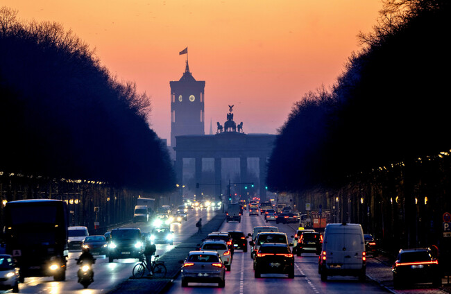 Cars move towards the Brandenburg Gate in Berlin Alamy Stock Photo