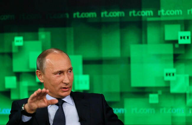 Russian President Vladimir Putin speaks during his visit to Russia Today's new studio in Moscow in June 2013. Alamy Stock Photo