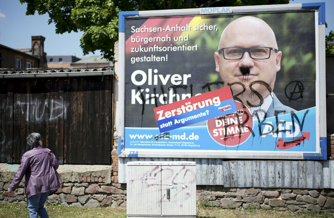 A vandalized election campaign poster for the far-right Alternative for Germany party showing the party's top candidate, Oliver Kirchner. Markus Schreiber