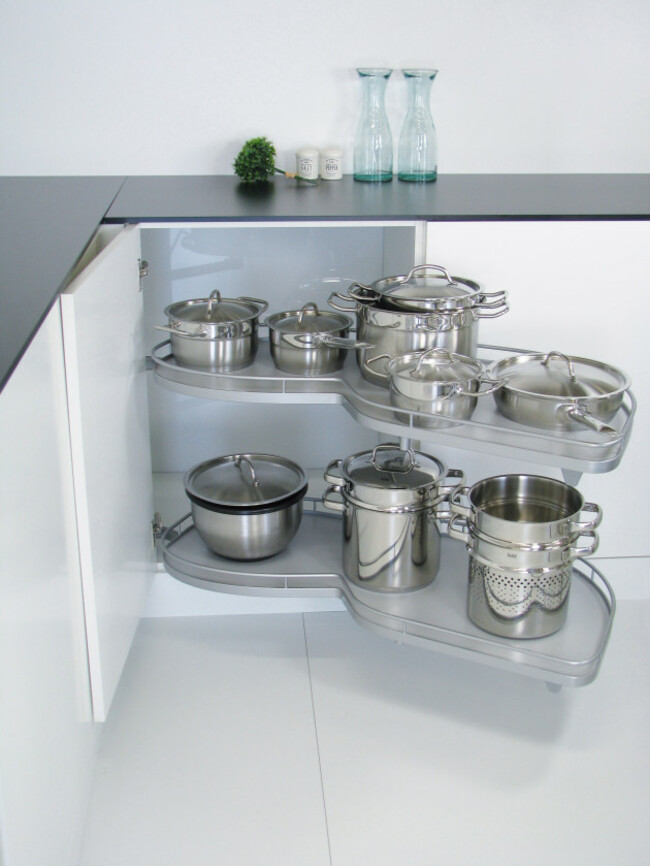 This Lemans kidney-shaped corner unit is ideal for making the most of that awkward space Cash & Carry Kitchens Cash & Carry Kitchens