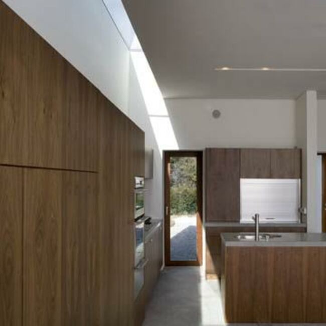 Inside both buildings, lots of consideration was taken with the internal finishes and bespoke furniture design. There is a walnut-veneered built-in unit that runs the entire length of the new build, and conceals a desk with a horizontal window above it, providing a view to the side garden and polished concrete floors throughout.