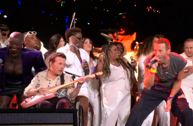 The Back to the Future star, who has Parkinson’s disease, was escorted on stage in a wheelchair and played guitar for the song Fix You alongside the band.