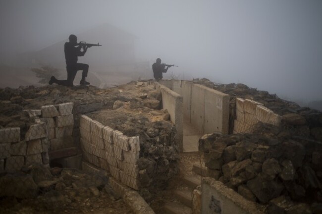 Metal boards in the shape of gunmen sit on an old bunker at an observation point on Mt. Bental in the Israeli controlled Golan Heights