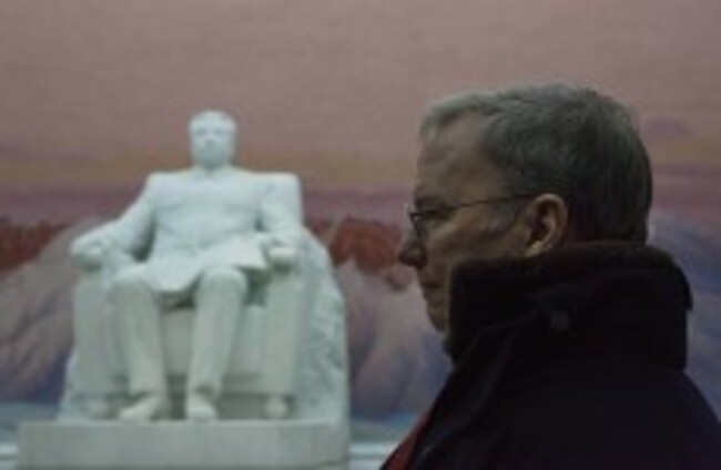 Google Executive Chairman Eric Schmidt stands near a statue of the late North Korean leader Kim Il Sung during his time in North Korea. AP Photo/David Guttenfelder