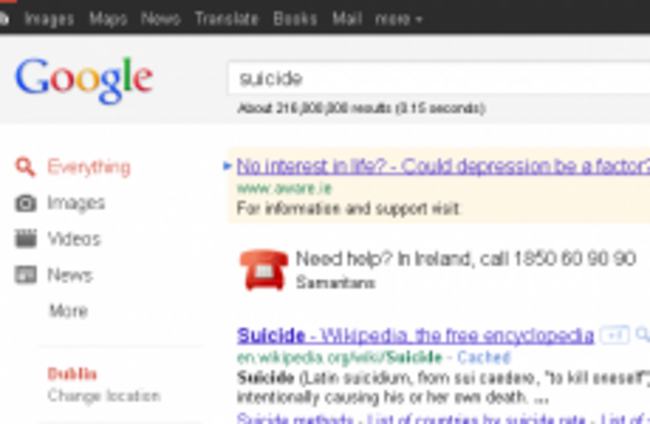 Google.ie users searching for 'suicide' will now be shown a phone number for Samaritans before the formal results.