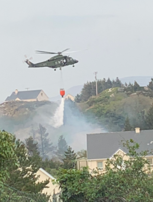 The Defence Forces said yesterday afternoon that an AW139 helicopter equipped for fire fighting operations was deployed to the scene and that 36 troops based in Finner Camp deployed to assist with fire fighting operations on the ground.