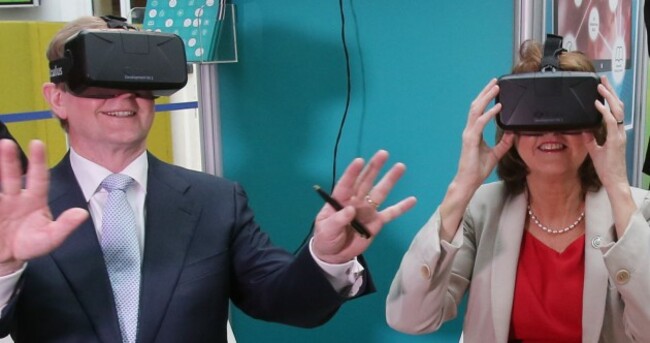 Enda Kenny and Joan Burton trying on some virtual reality goggles. Niall Carson