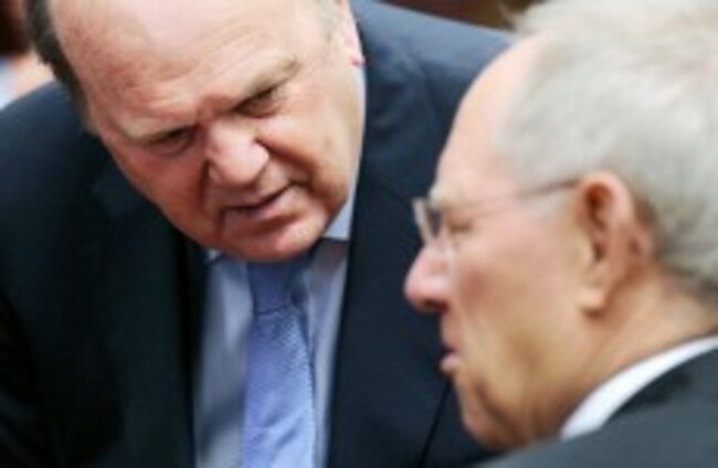 Michael Noonan speaks with German finance minister Wolfgang Schauble. Noonan will meet with his Eurozone counterparts today where more discussions on lowering Ireland's interest rate on European borrowings will again dominate the agenda. Geert Vanden Wijngaert/AP