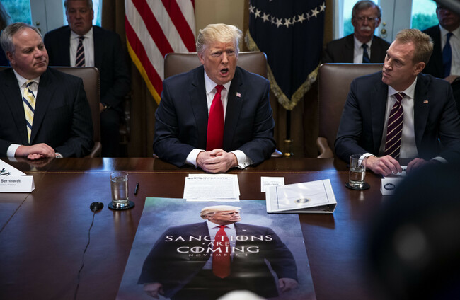 U.S. President Donald Trump speaks beside David Bernhardt, acting U.S. secretary of interior, left, and Patrick Shanahan, acting U.S. secretary of defense, during a cabinet meeting in the Cabinet Room of the White House yesterday. Al Drago/Bloomberg /ABACAPRESS.COM