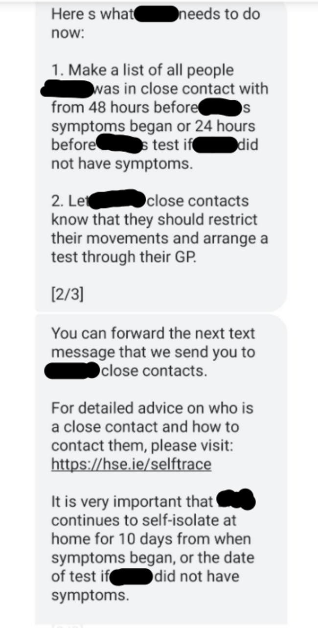 “The HSE is asking [person who has tested positive for Covid-19] to pass on this text to their close contacts.