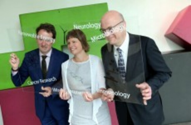 (L-R) Minister Seán Sherlock, DCU researcher Aoife Morren, SFI director-general Mark Ferguson. Jason Clarke Photography