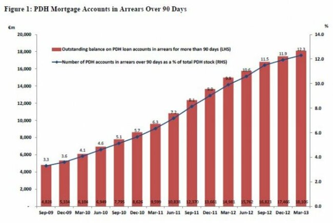 In September 2009, 3.3 per cent of primary home mortgages were in arrears of over three months, accounting for just over €480 million in money owed to banks and building societies.