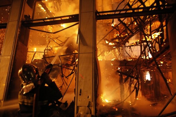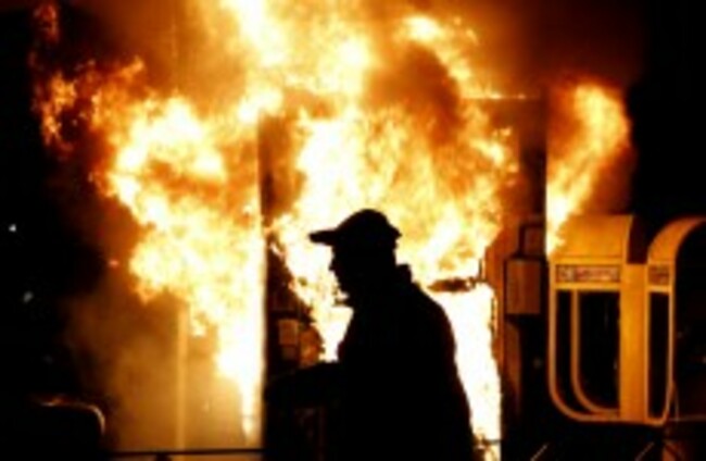 A bus ticket kiosk burns in Athens. Kostas Tsironis/AP/Press Association Images