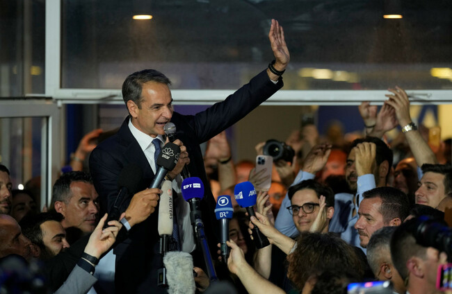 Kyriakos Mitsotakis addresses supporters at the headquarters of his party in Athens. Petros Giannakouris/AP