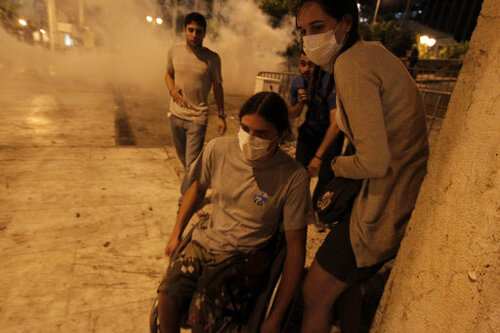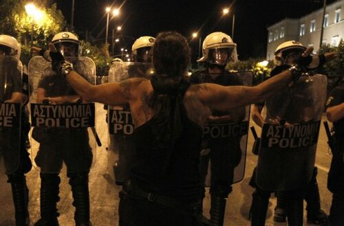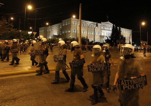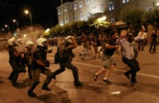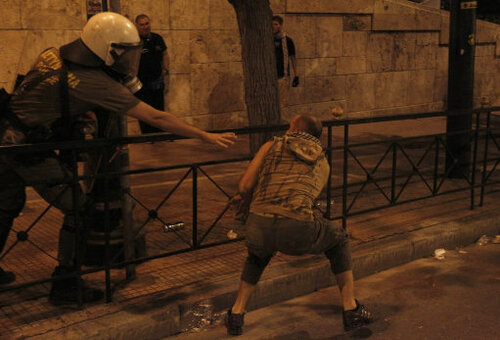 Greek riot police tackling protesters in Athens early this morning. AP Photo/Lefteris Pitarakis