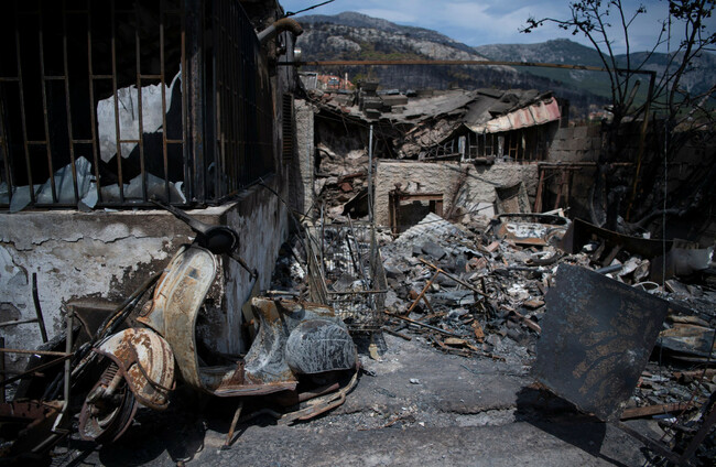 A burned scooter is seen in Acharnes suburb, on Mount Parnitha, in north-western Athens AP Photo/Michael Varaklas