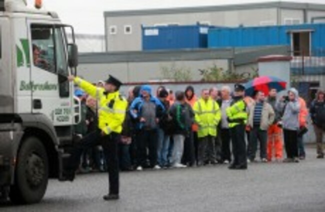 Gardai redirect trucks bound for Greyhound Recycling away from its entrance, which is blocked by supporters of the striking workers on Crag Avenue in Clondalkin this morning. Laura Hutton/Photocall Ireland