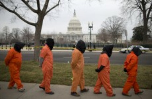 Demonstrators dressed as detainees march past the Capitol building during a rally against the US military detention facility in Guantanamo Bay in January. Evan Vucci/AP