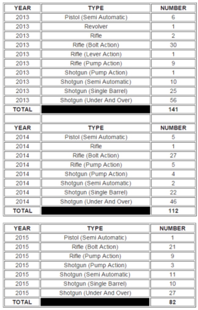 Figures provided to TD Tommy Broughan following a parliamentary question show 141 firearms licences were revoked in 2013, 112 in 2014 and 82 last year.