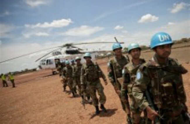 Indian soldiers serving with the international peacekeeping force arrive by helicopter in Abyei, Sudan. AP Photo/UNMIS, Stuart Price
