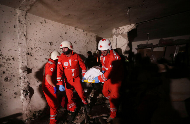 Red Cross volunteers carry a body from a damaged house hit by Israeli shelling in the town of Chebaa, Lebanon Alamy Stock Photo