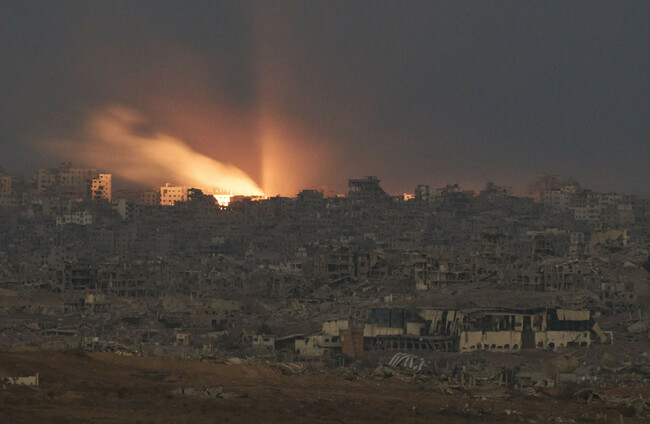 A fire erupts amid buildings destroyed during Israeli ground and air operations in Gaza PA
