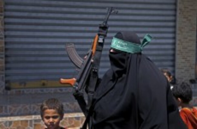 A Hamas supporter holds an AK-47 as she attends a demonstration against the Israeli military operations in the West Bank. AP/Press Association Images