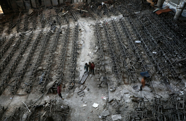 Displaced Palestinian children at the Islamic University of Gaza, which was damaged by Israeli bombardment Alamy