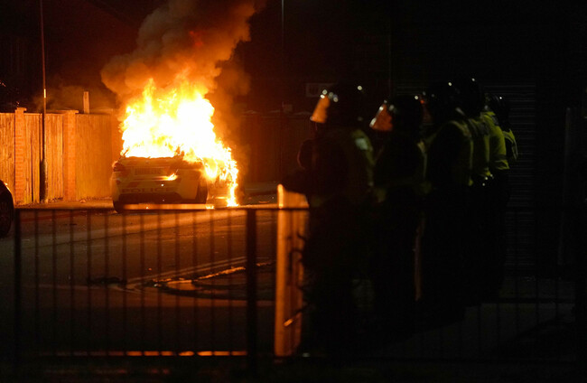 A police car burns as officers are deployed on the streets of Hartlepool following a violent protest. (Owen Humphreys/PA)