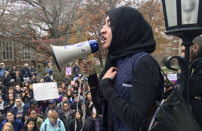File photo of Eeman Abbasi speaking during a protest on the University of Connecticut campus against the election of Republican Donald Trump. AP Photo/Pat Eaton-Robb