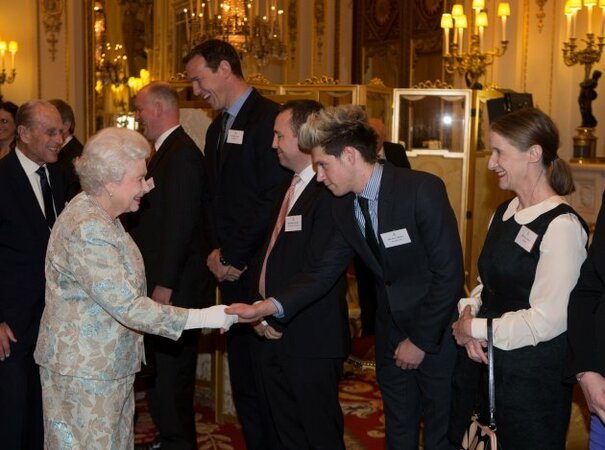 Source: Queen Elizabeth II accompanied by the Duke of Edinburgh meets One Direction's Niall Horan" title="">