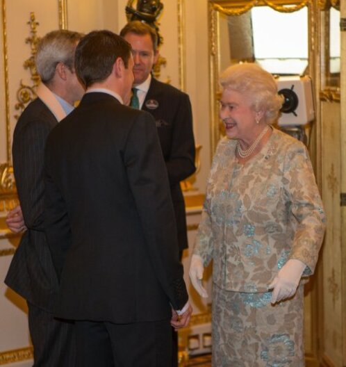 Source: Queen Elizabeth II meets Barry Geraghty (2nd left) and Ruby Walsh (left, partially obscured) at a reception for the Irish community at Buckingham Palace, London." title="">