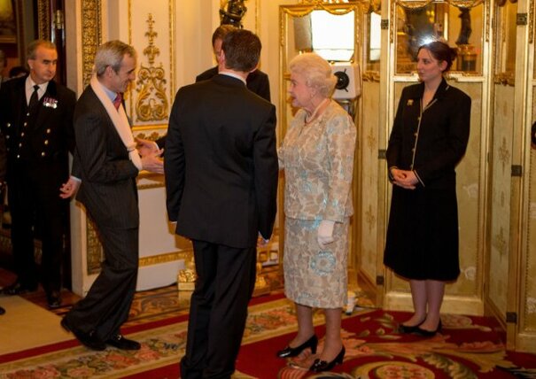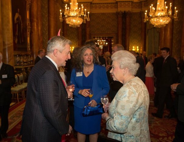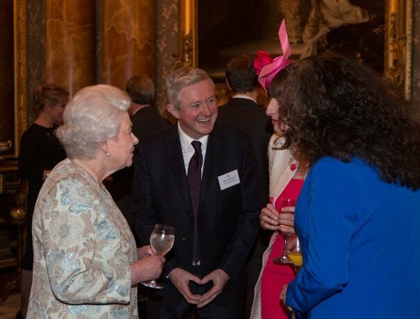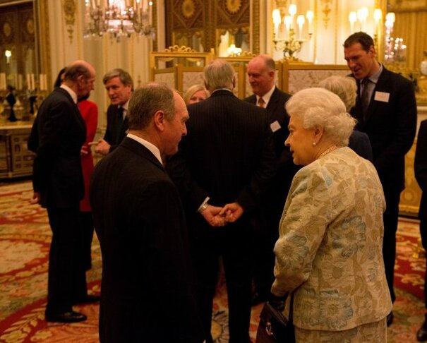 Source: ueen Elizabeth II talks to Louis Walsh (2nd left) at a reception for the Irish community at Buckingham Palace, London." title="">