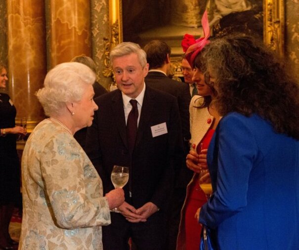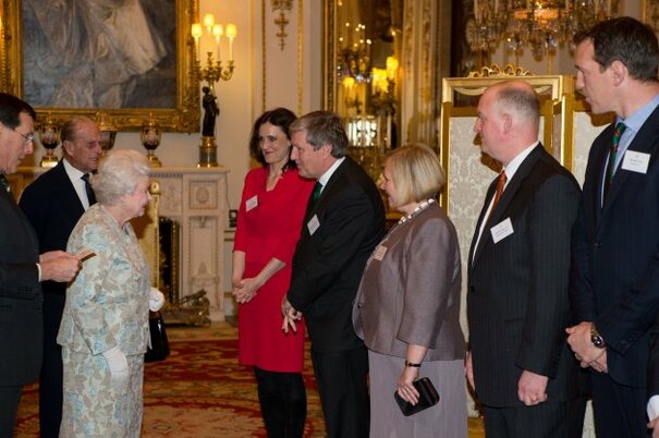 Source: Queen Elizabeth II meets Irish Ambassador Dan Mulhall (4th right) at a reception for the Irish community at Buckingham Palace, London." title="">