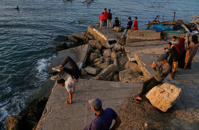 Palestinians look at the Mediterranean Sea at the port of Gaza City Alamy