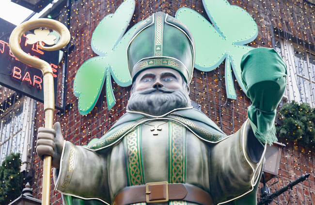The Temple Bar, Dublin city centre’s tourist magnet, installed a giant statue of St Patrick raising a pint of Guinness this morning.