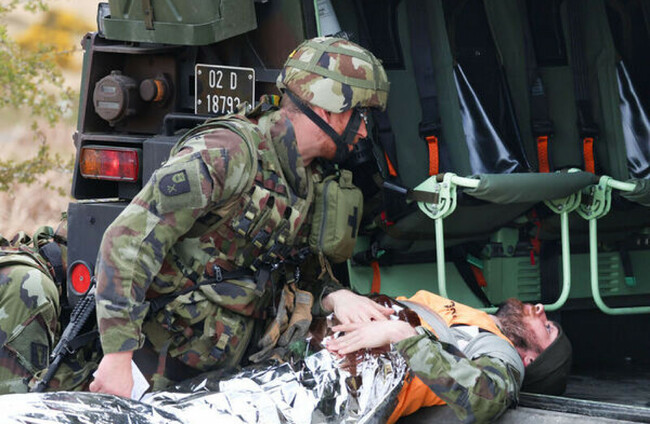 An Irish soldier helps a colleague during a simulated bomb attack on an Irish convoy during a mission readiness exercise ahead of their deployment to Lebanon in the coming weeks.