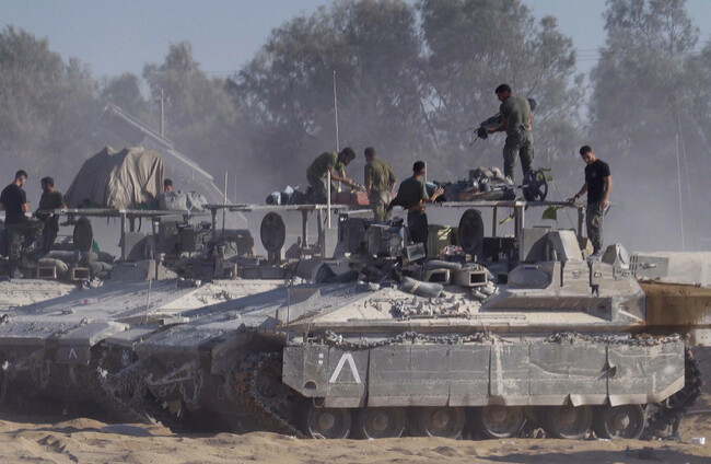 Israeli soldiers carry out maintenance on military armored vehicles near the border of the southern Gaza Strip earlier this year. Alamy Stock Photo