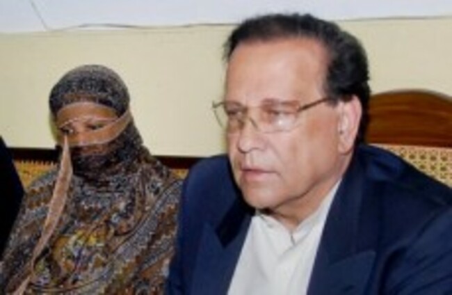 Salman Taseer, right, talks to reporters after meeting with Pakistani Christian woman Asia Bibi, left, at a prison in Sheikhupura near Lahore, Pakistan, on Saturday, Nov. 20, 2010.