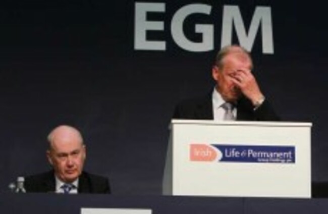 Irish Permanent chairman Alan Cook (right) and CEO Kevin Murphy pictured at last week's EGM, when shareholders voted to block the government's latest recapitalisation. Leon Farrell/Photocall Ireland