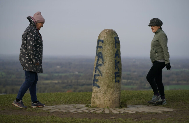 Members of the public look at graffiti on the Lia Fail standing stone, which is also known as the Stone of Destiny, on the Hill of Tara near Skryne in Co Meath