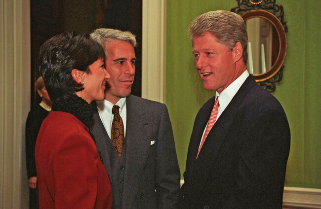 Bill Clinton pictured with Jeffrey Epstein and Ghislaine Maxwell at the White House in 1993. Alamy Stock Photo